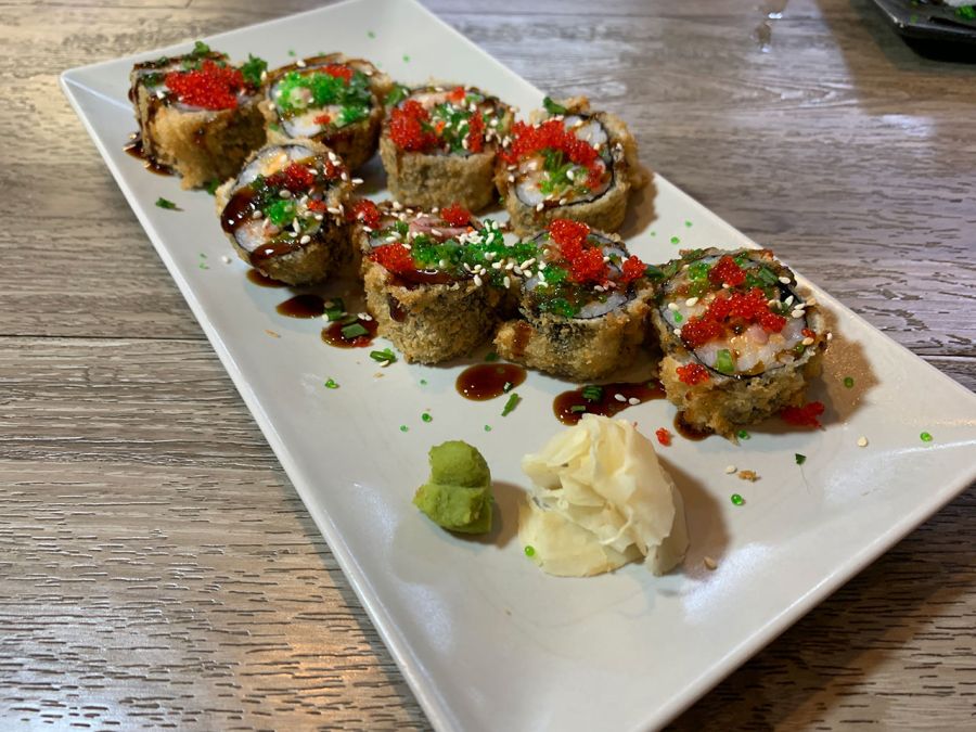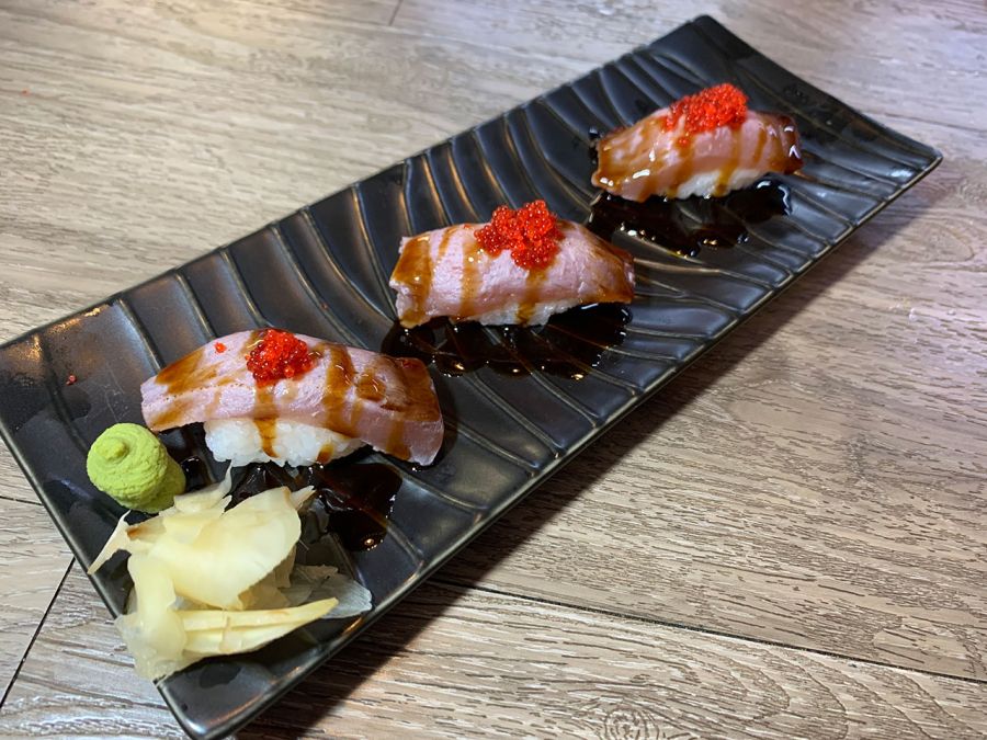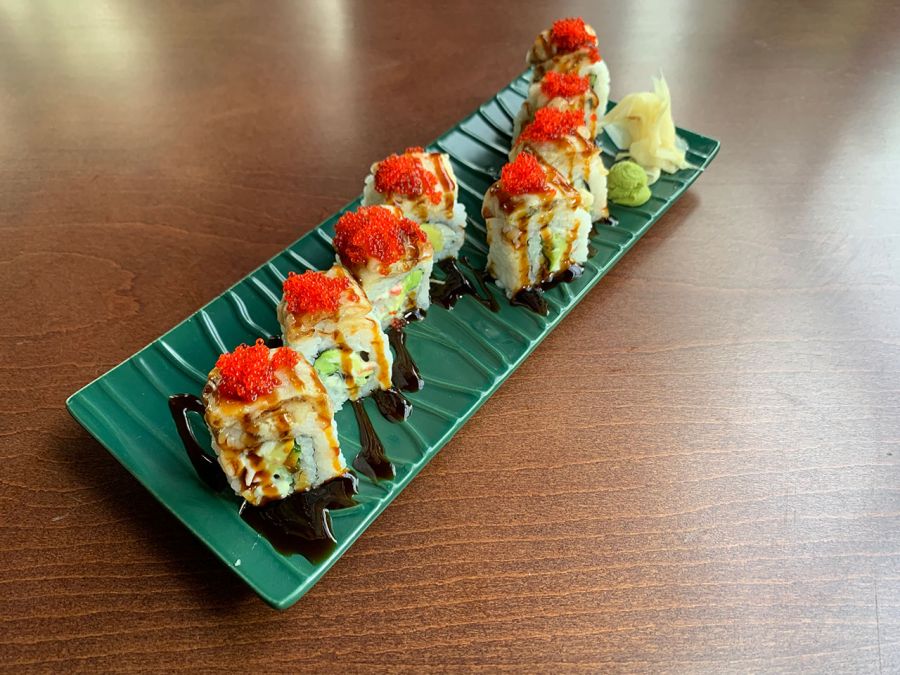 Φρέσκια γαρίδα, ψητό χέλι, αβοκάντο, σως χελιού
