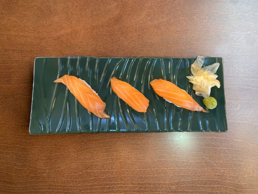 Τηγανητός σολωμός, σως χελιού, σκονη κρεμμυδιού, καβουροσαλάτα, σουσάμι