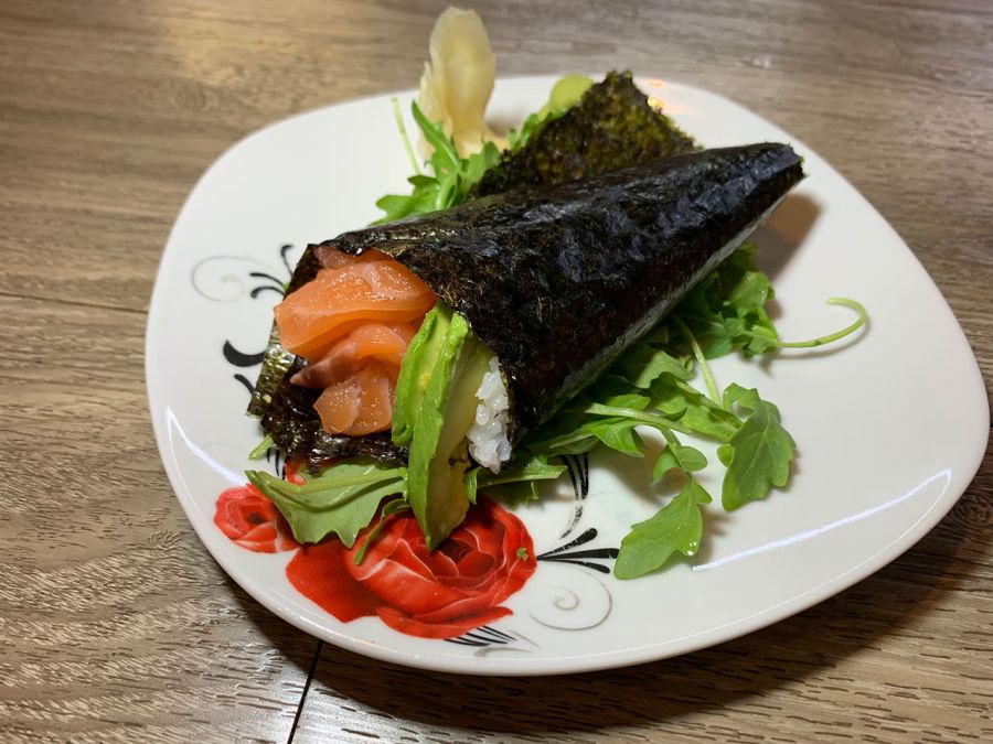 Σολωμός, αβοκάντο, αγγούρι, τσίλι σως, σκόνη κρεμμυδιού, σως καβουριού